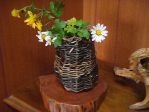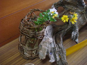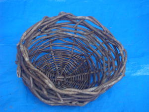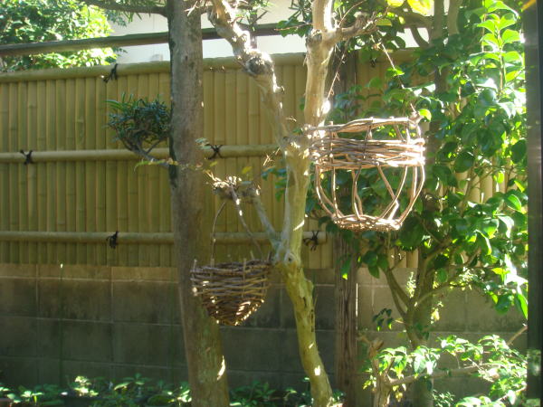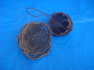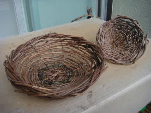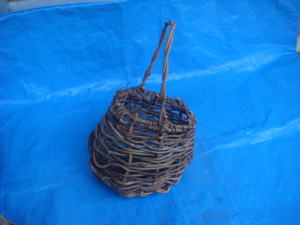 上のは、庭木に下げた籠です。 下は、編んだ籠です。